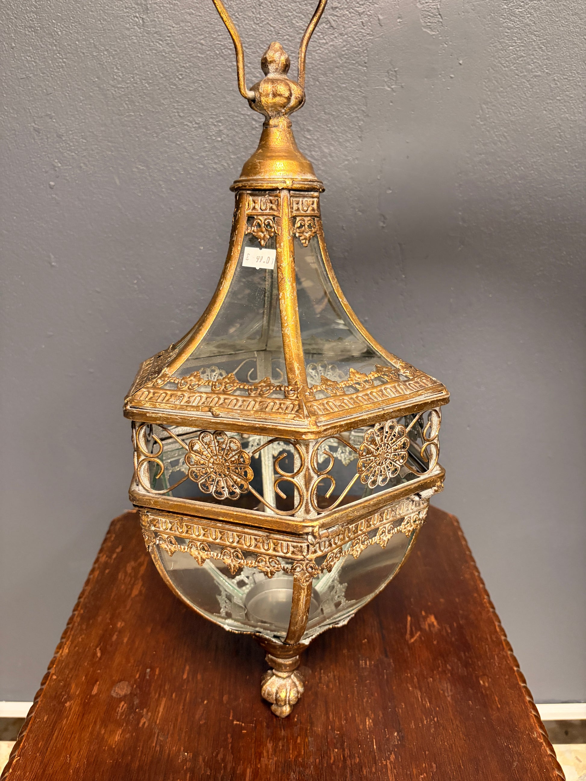 Sehr dekorative antike Hängelaterne aus Messing mit Glasflächen und aufwendig gearbeiteten Ornamenten. Klassische Laternenform mit Kettenaufhängung.