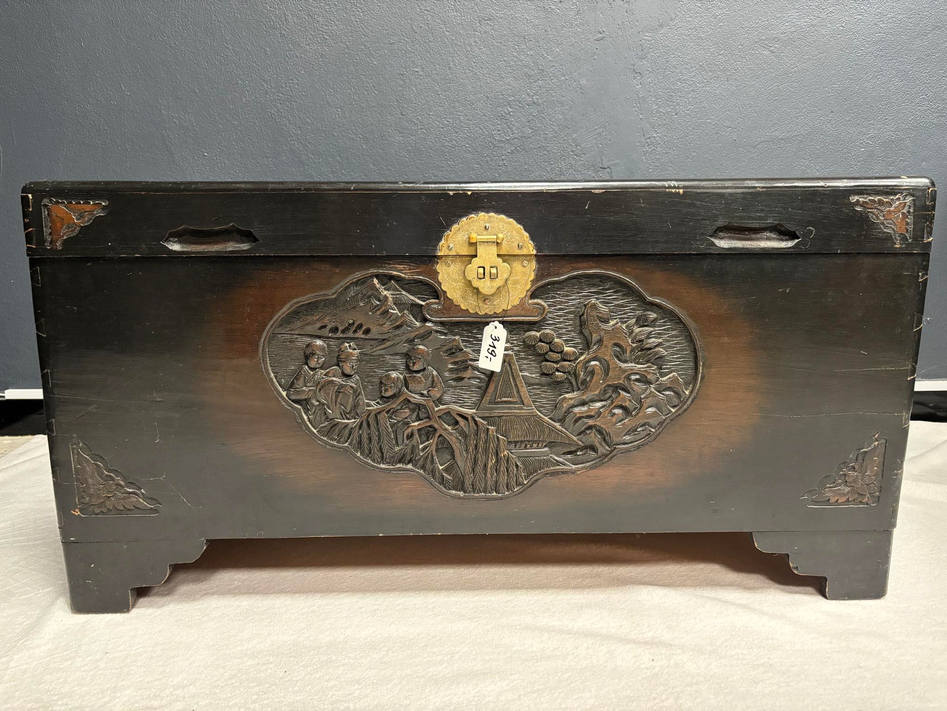 Antike Holztruhe – handgeschnitzt, asiatisches Motiv