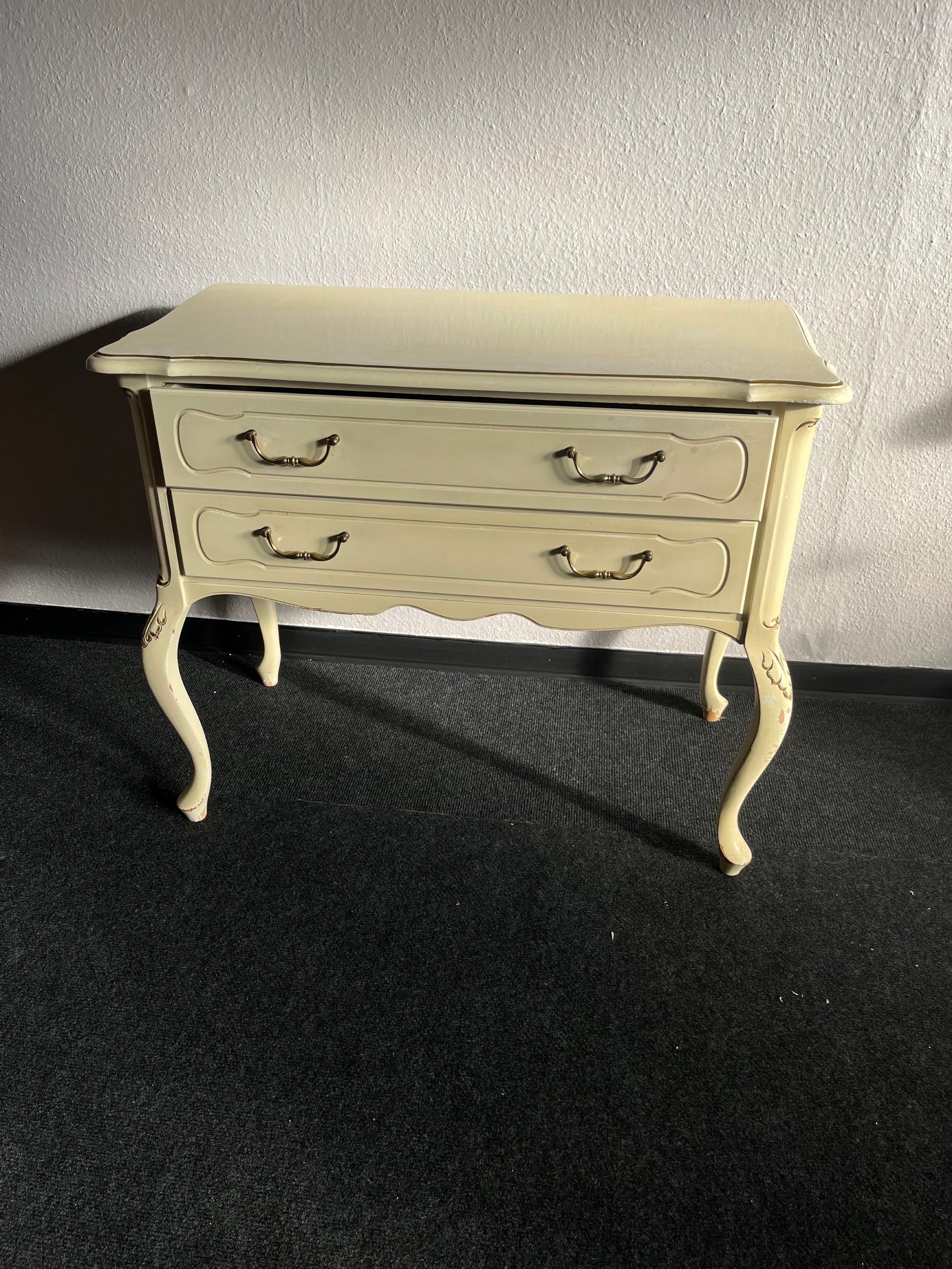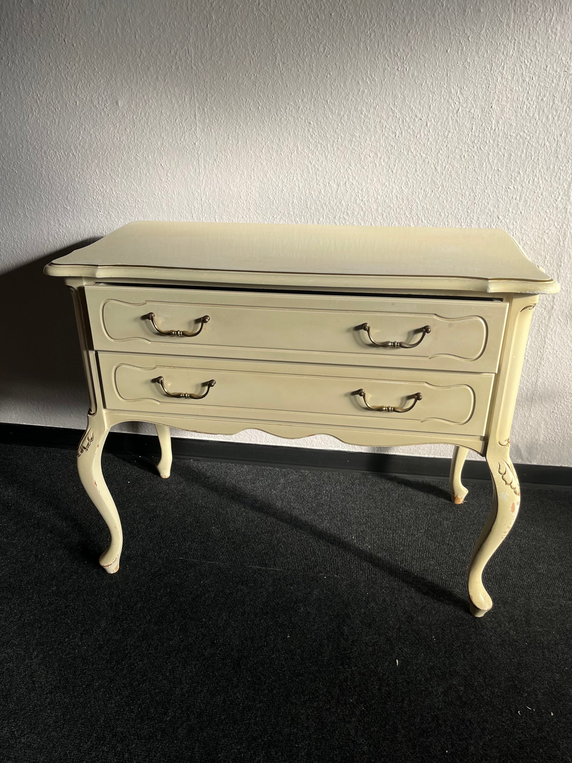 Diese elegante Kommode im Barockstil überzeugt mit ihren geschwungenen Beinen, den zarten Verzierungen und der warmen cremeweißen Farbgebung. Zwei geräumige Schubladen mit dekorativen Metallgriffen bieten praktischen Stauraum. Das Möbelstück hat leichte Alters- und Gebrauchsspuren, die seinen Vintage-Charakter noch unterstreichen.