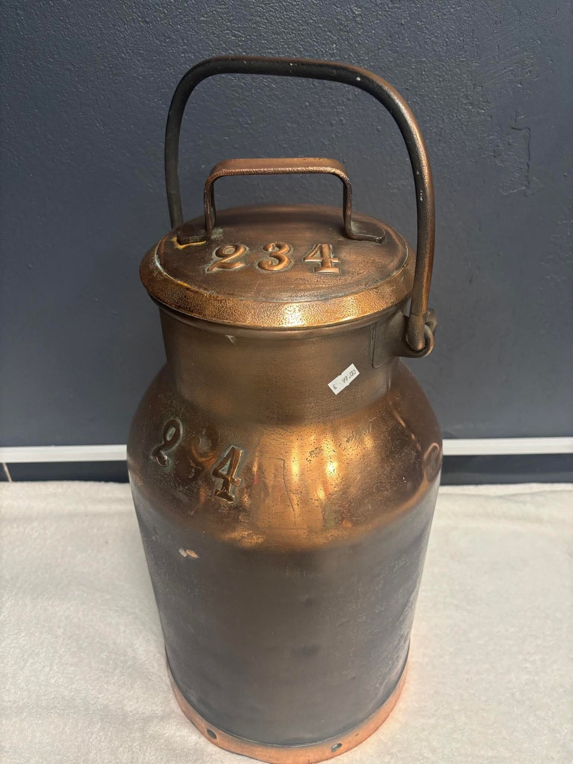 Antike Kupfer-Milchkanne mit geprägter Nummer