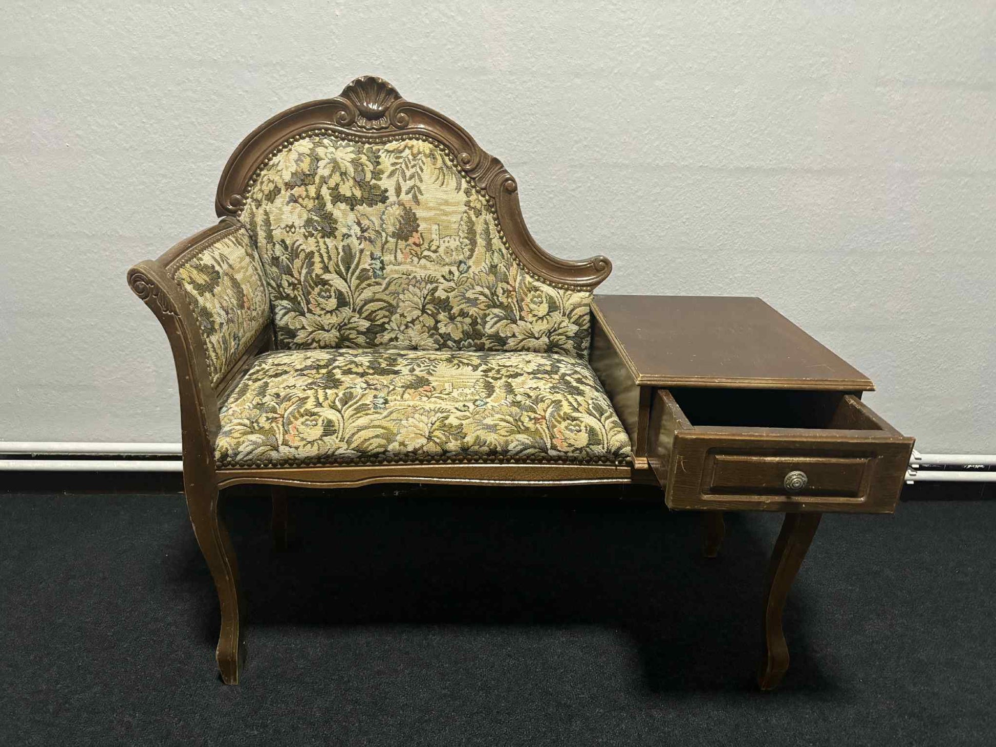 Charmante antike Telefonbank mit floral gemustertem Gobelinbezug und elegant geschwungenem Holzrahmen. Rechtsseitig befindet sich eine praktische Ablagefläche mit Schublade, ideal für Aufbewahrung von Kleinigkeiten. Dieses Stück vereint Funktionalität mit klassischem Design und eignet sich perfekt als dekoratives Möbelstück im Flur oder Wohnzimmer. Ein stilvoller Blickfang mit nostalgischem Charakter.