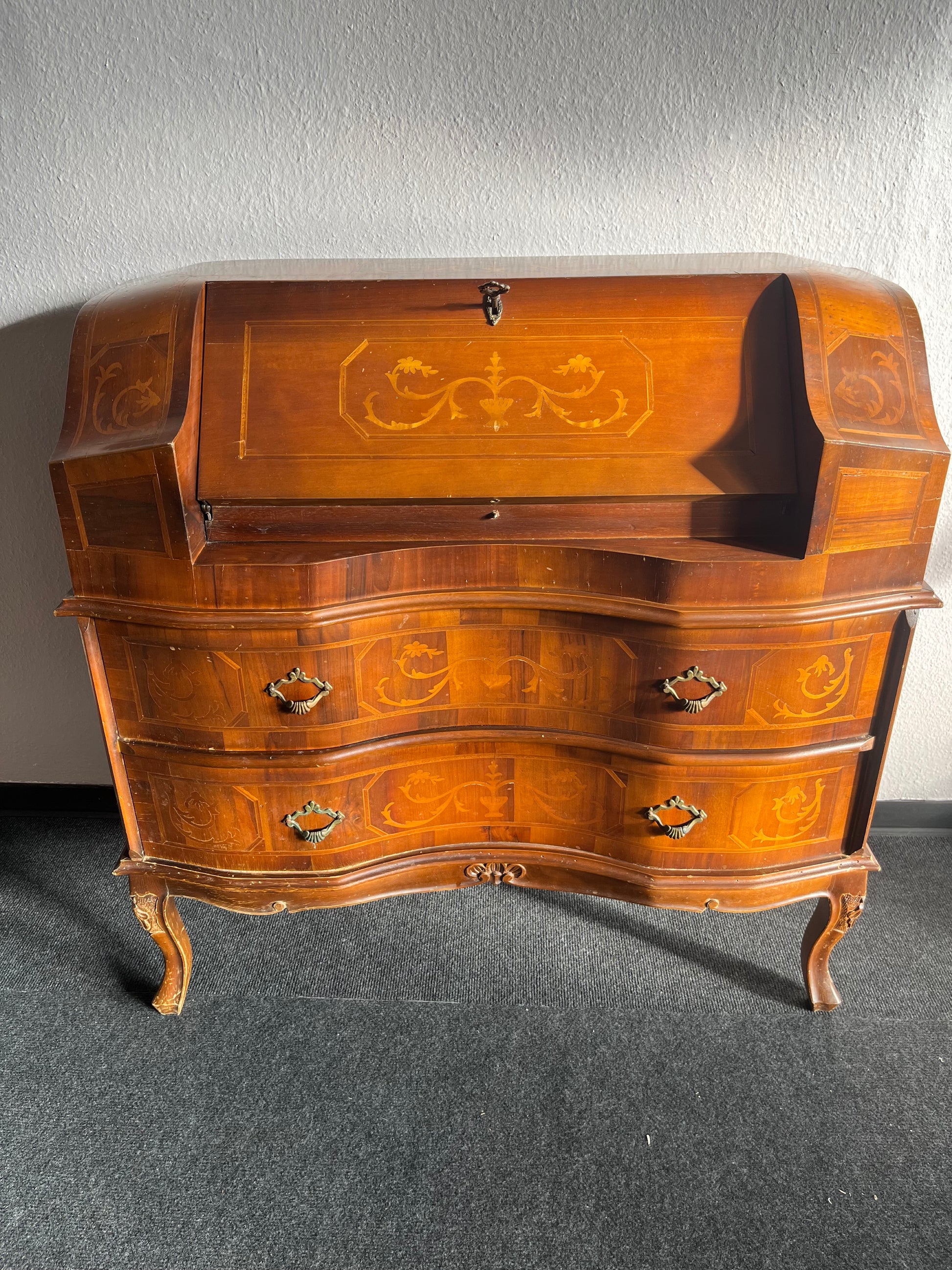 Wunderschöner antiker Sekretär im Barockstil mit kunstvoller Intarsienarbeit und geschwungener Front. Das Möbelstück verfügt über eine Klappe mit abschließbarem Fach sowie drei große Schubladen, die reich verziert sind. Auf eleganten, geschwungenen Beinen stehend, verleiht dieser Sekretär jedem Raum einen Hauch von Luxus und klassischer Eleganz.