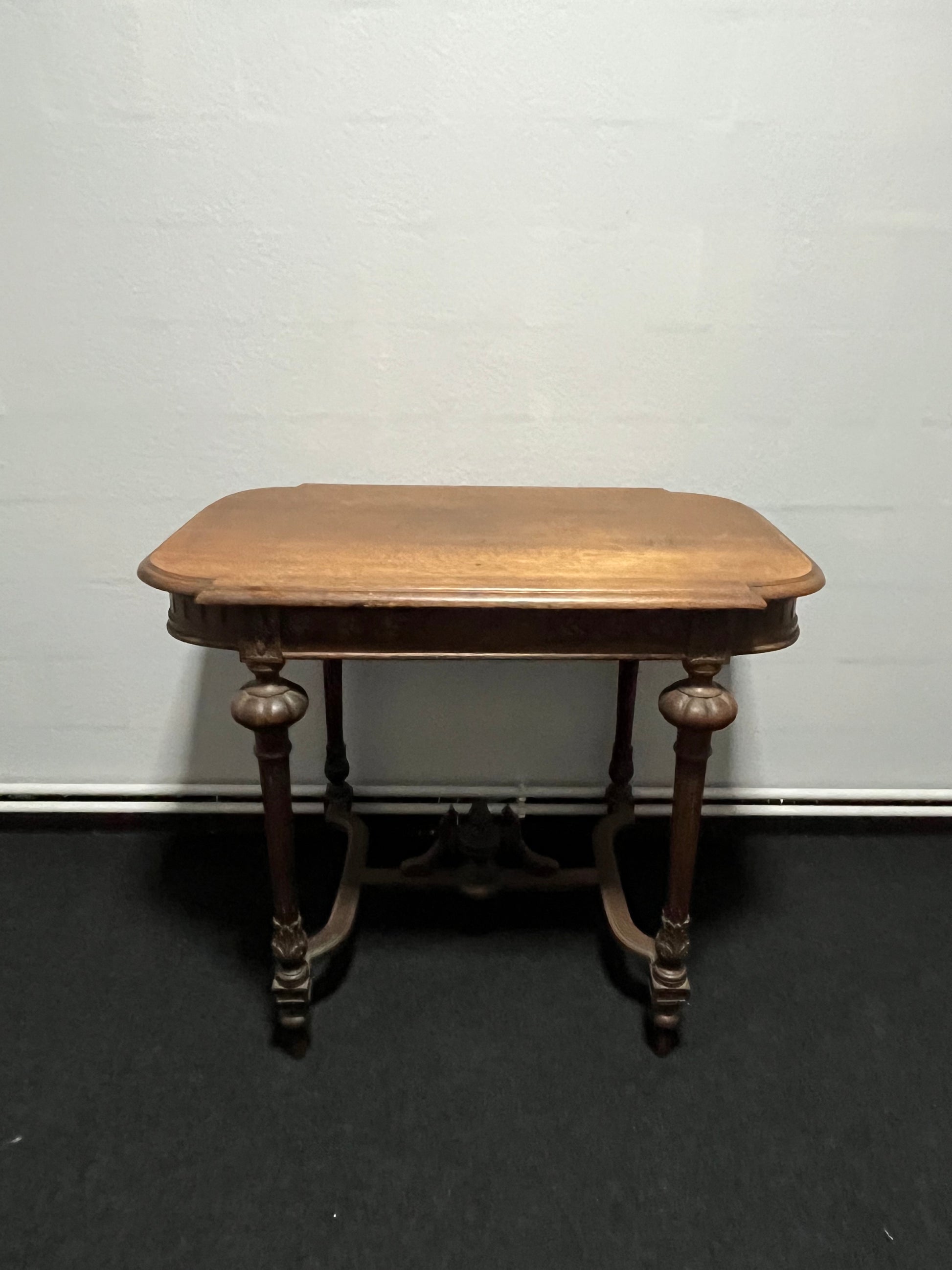 Wunderschöner antiker Beistelltisch aus massiver Eiche, datiert um 1900. Der Tisch besticht durch seine elegante Formgebung, gedrechselte Beine und feine Zierdetails am Untergestell. Die rechteckige Platte mit leicht geschwungenen Kanten verleiht ihm einen besonderen Charakter. Ein stilvolles Möbelstück, das sich perfekt als Beistelltisch, Konsolentisch oder kleiner Schreibtisch eignet. Originalzustand mit schöner Patina.