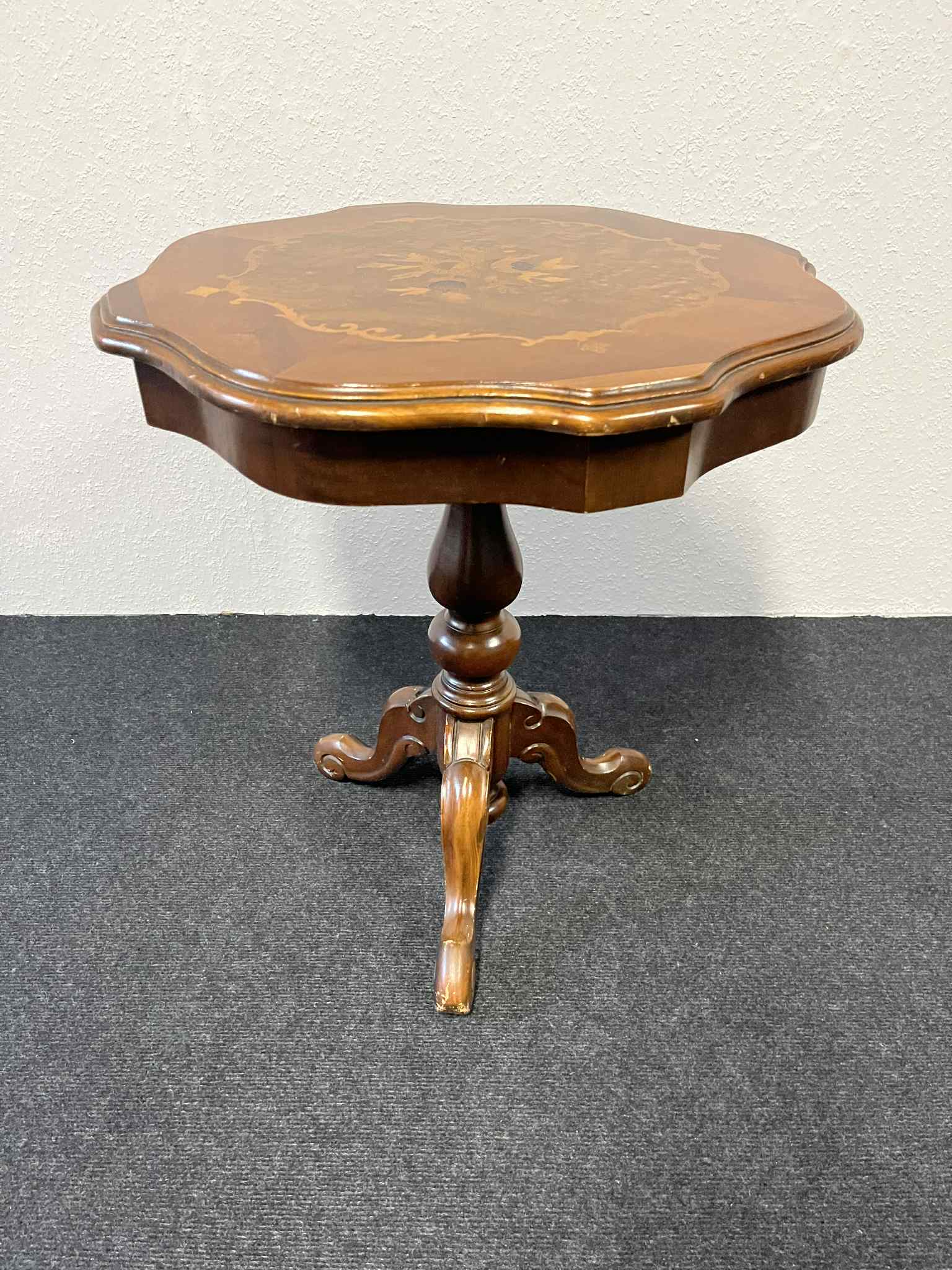 Dieser elegante, antike Beistelltisch ist ein echtes Highlight für jedes Wohnzimmer oder Büro. Mit einer Höhe von 60 cm und einer Tischplatten-Breite von 55 cm ist er nicht nur praktisch, sondern auch ein Kunstwerk. Die Tischplatte besticht durch kunstvolle, florale Intarsien aus verschiedenen Holzarten, die sorgfältig von Hand eingelegt wurden. Die geschwungenen Kanten und der gedrechselte, massive Fuß auf drei Beinen verleihen ihm einen klassischen und stabilen Charakter. Die charmante Patina und die kleinen Gebrauchsspuren erzählen seine eigene Geschichte und unterstreichen den authentischen Vintage-Charakter. Ein perfektes Möbelstück, um eine Lampe, Bücher oder eine Vase stilvoll zu präsentieren.