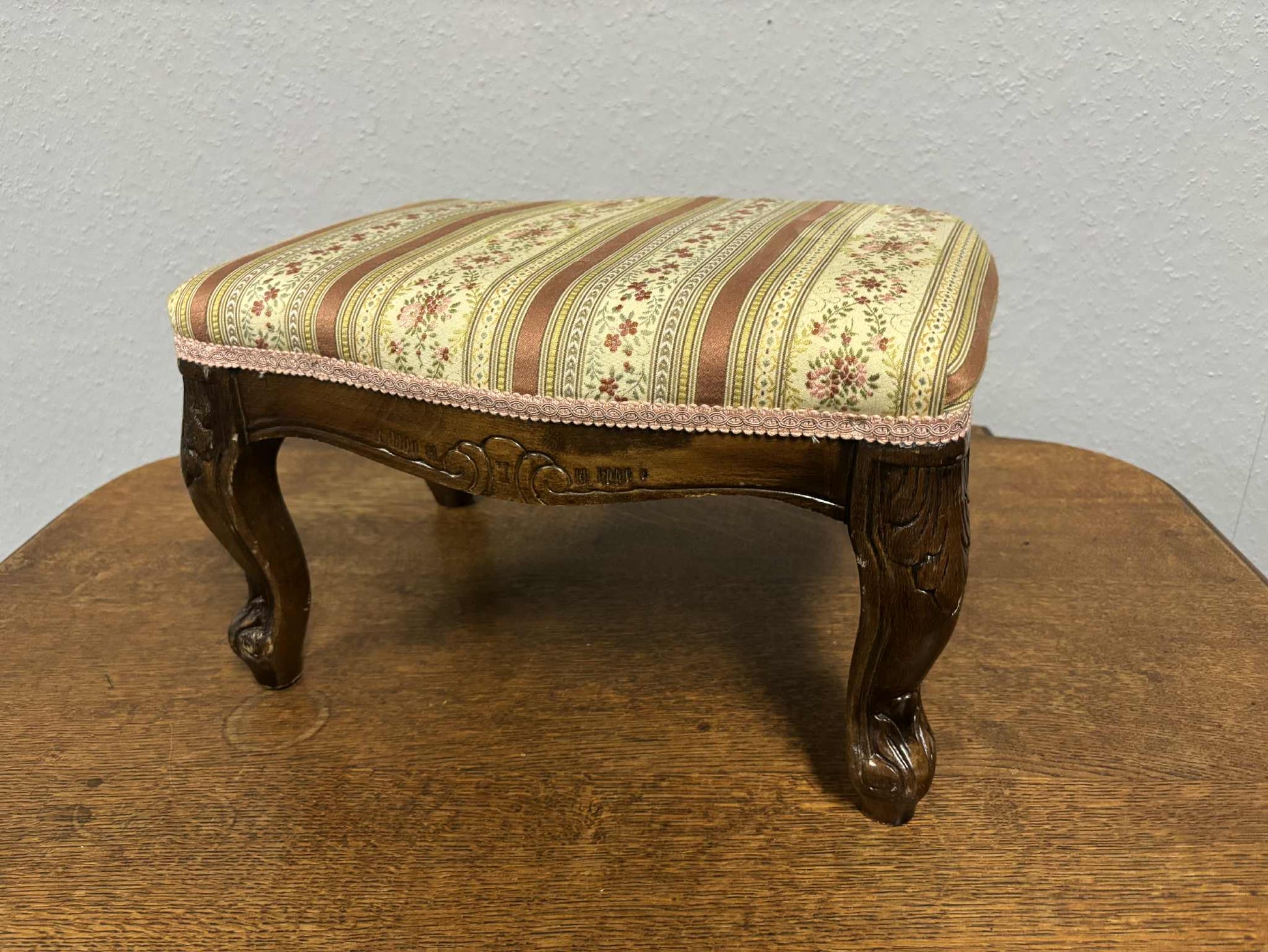 Charmanter antiker Fußhocker mit stabilem Holzrahmen und gestreiftem Polsterbezug in warmen Farben. Mit den Maßen 40 × 30 × 24 cm bietet er nicht nur praktischen Komfort, sondern auch einen dekorativen Blickfang.