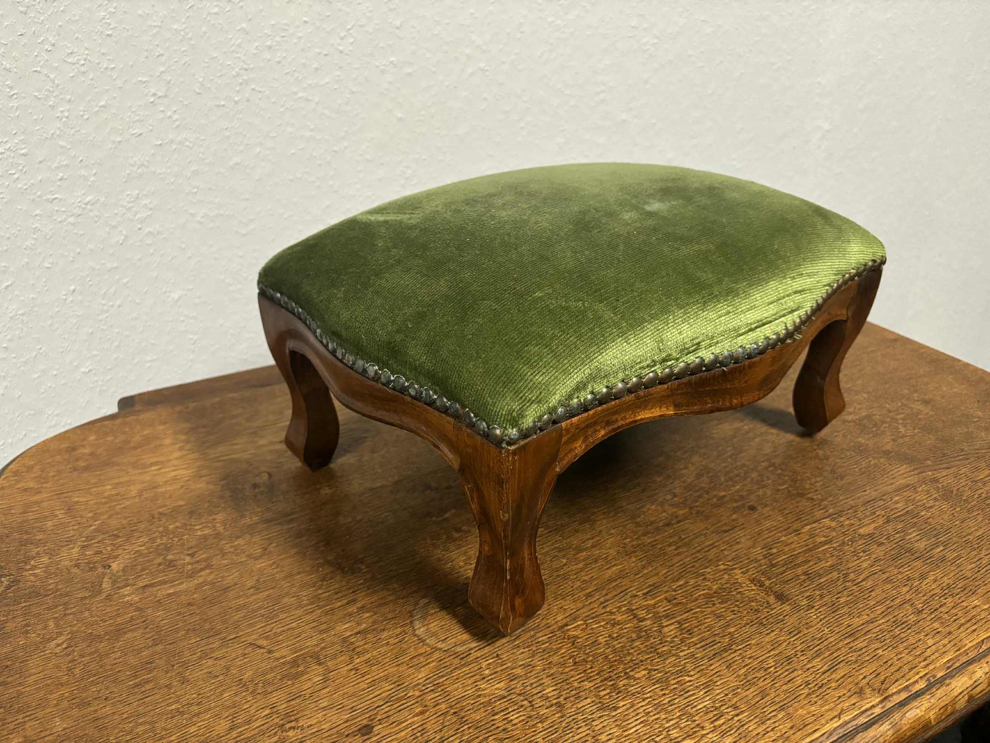 Antiker Fußhocker mit grünem Samtbezug