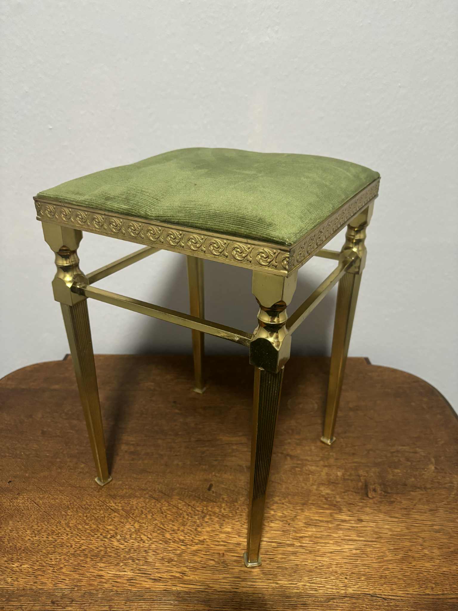 Eleganter antiker Hocker bzw. kleiner Beistelltisch aus massivem Messing mit dekorativen Verzierungen an den Kanten. Das Sitzpolster ist mit einem grünen Stoff bezogen und verleiht dem Stück eine edle, klassische Note. Durch die aufwendig gearbeiteten, kannelierten Beine und die stabile Ausführung ist dieses Möbelstück nicht nur praktisch, sondern auch ein dekorativer Blickfang.