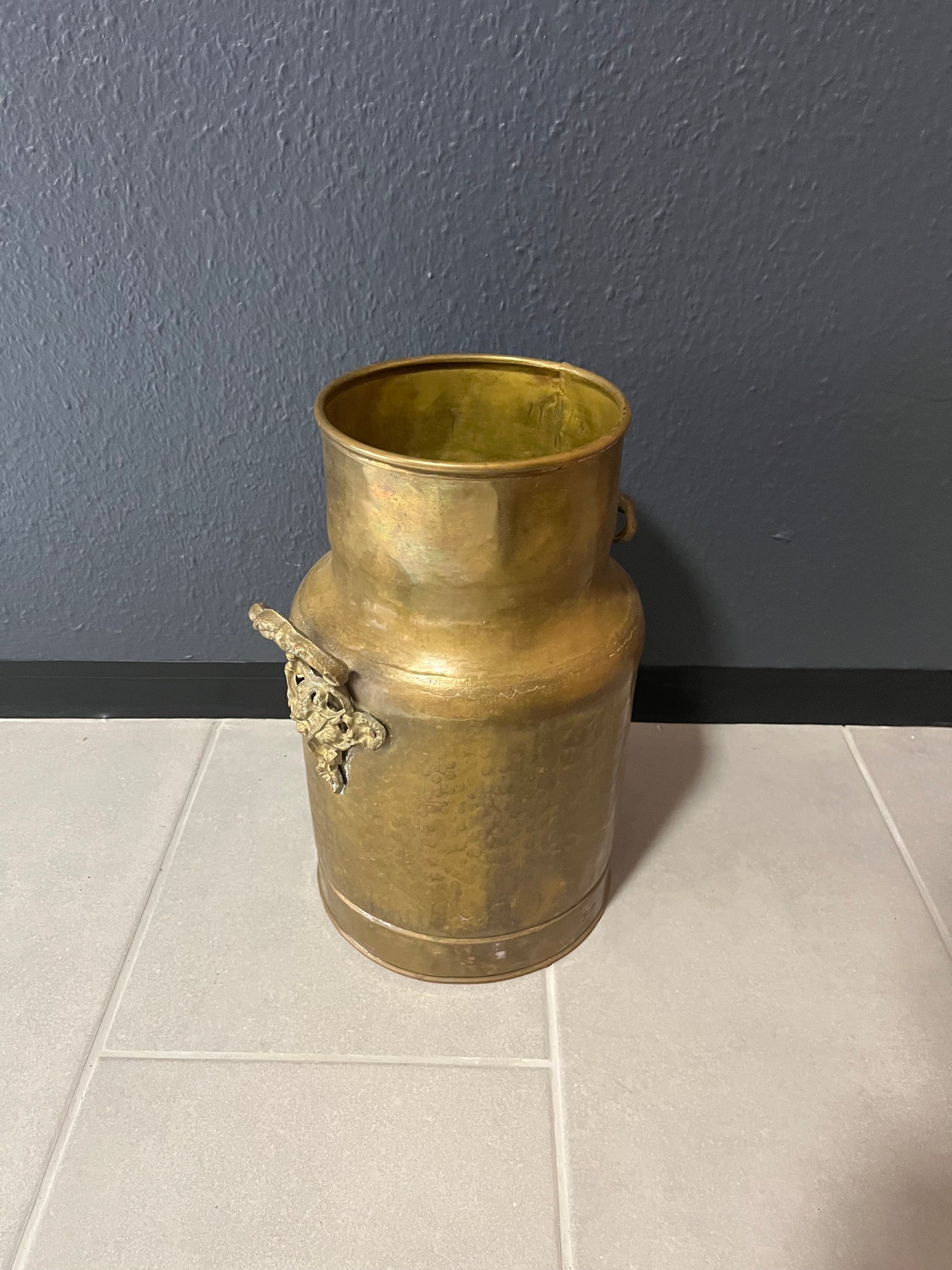Solider, handgehämmerter Messingtopf im rustikalen Stil, ausgestattet mit dekorativen Löwenkopfgriffen. Natürliche Patina und Handarbeitsspuren verleihen einzigartigen Vintage-Charakter.