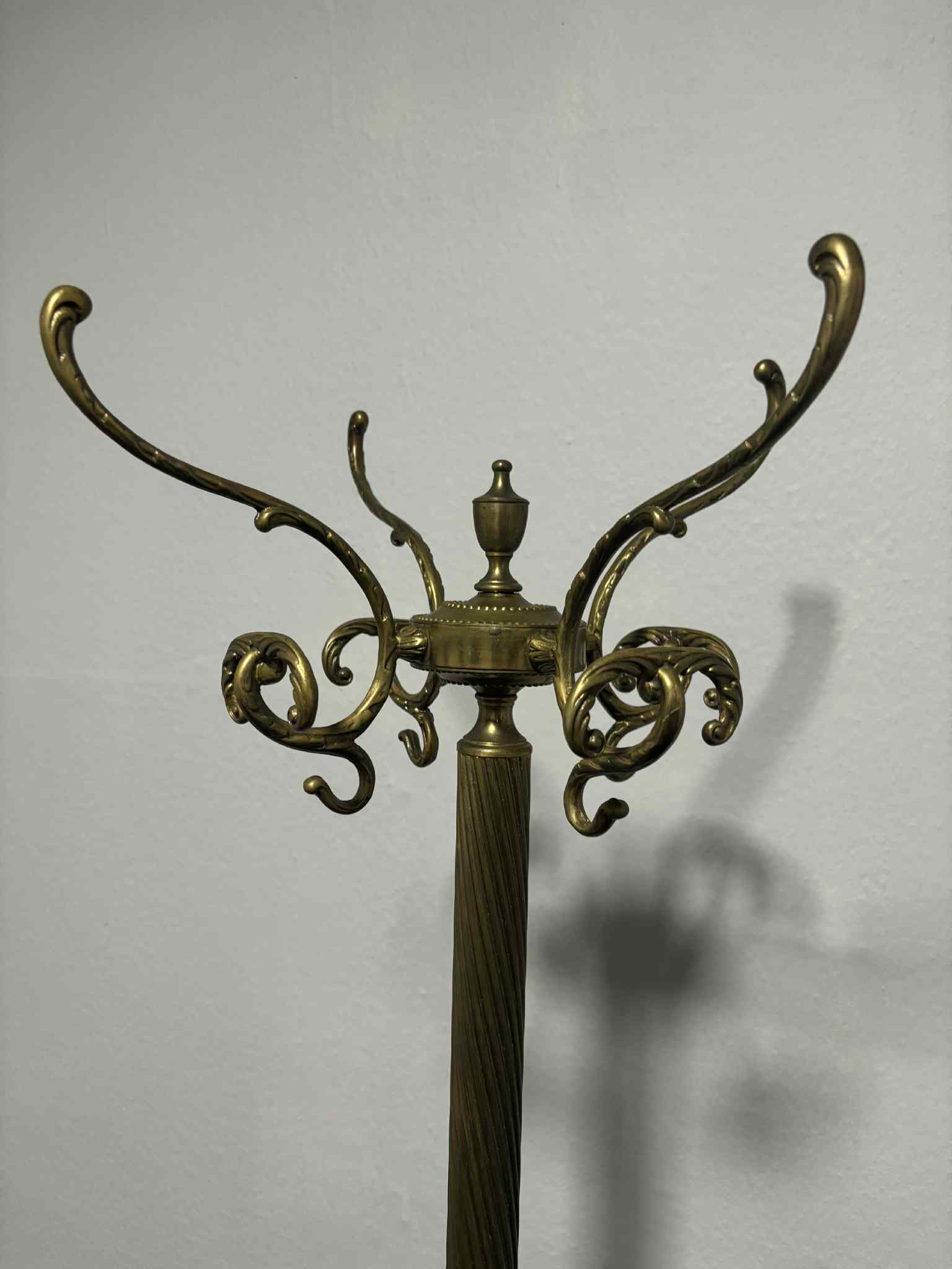 Hochwertiger Garderobenständer aus Messing mit dekorativ gedrehtem Mittelstab und kunstvoll geschwungenen Haken. Der stabile Dreifuß sorgt für sicheren Stand. Perfekt für klassische und elegante Interieurs.