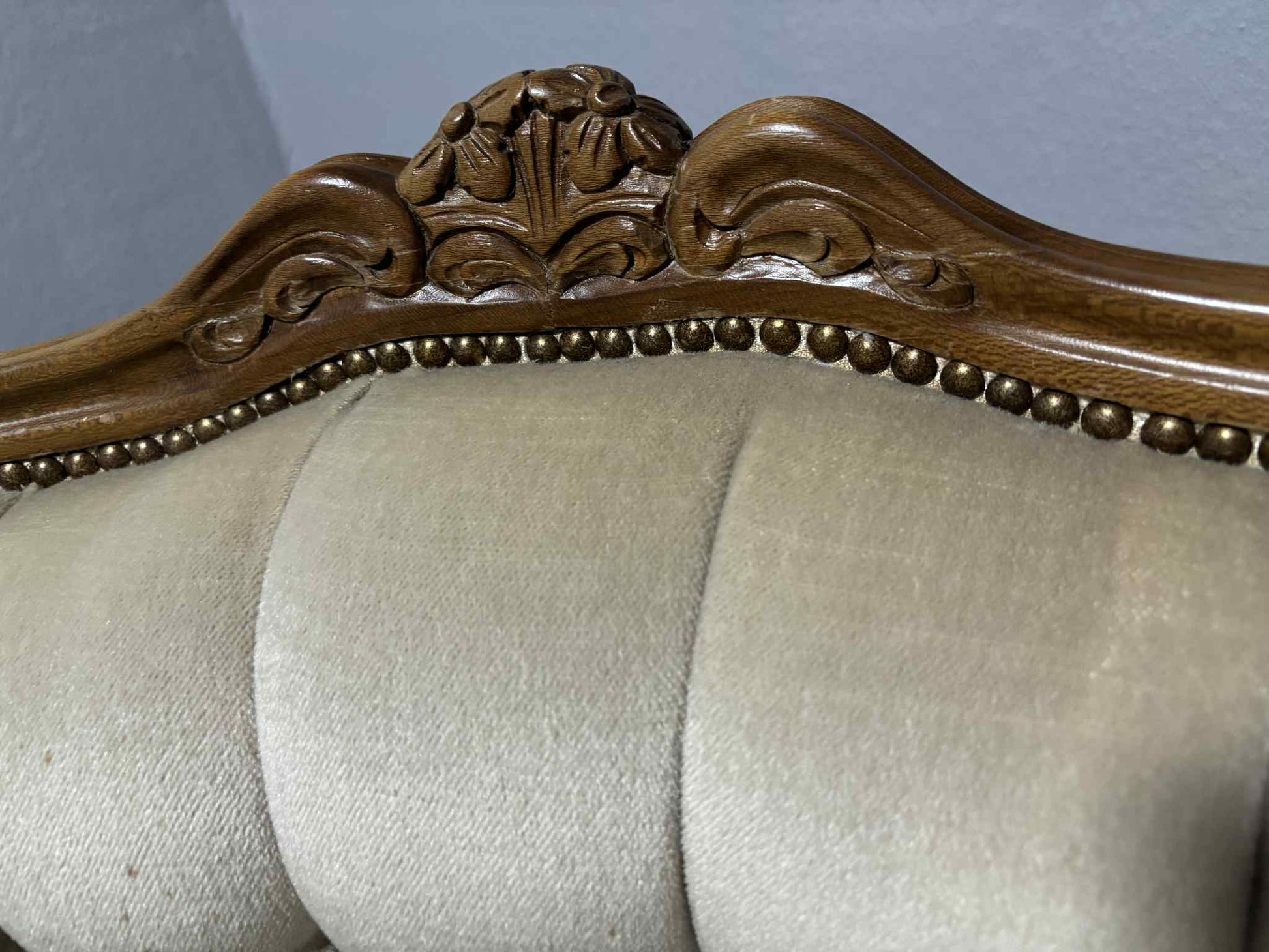 Eleganter antiker Ohrensessel im französischen Louis XV Stil mit reich verziertem Holzrahmen und cremefarbenem Polsterbezug. Die hohe, geschwungene Rückenlehne mit dekorativer Knopfheftung sorgt für ein edles Erscheinungsbild und hohen Sitzkomfort.
