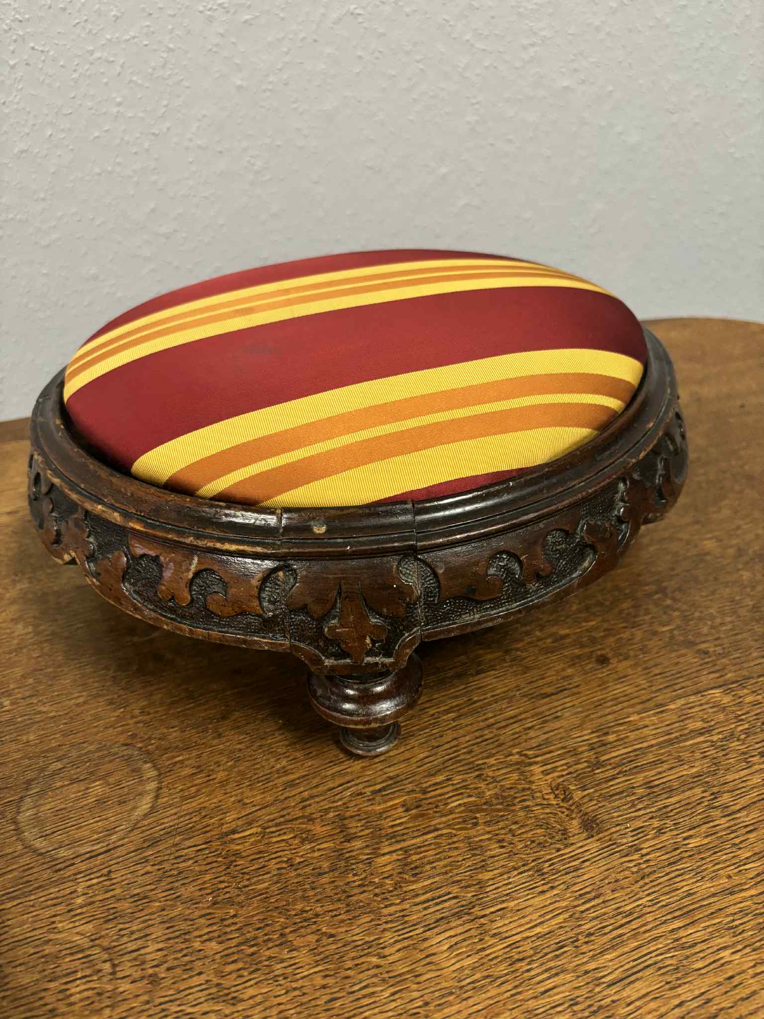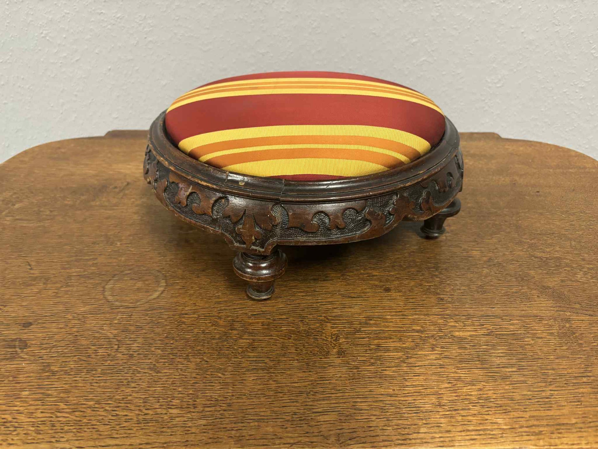 Schöner antiker runder Fußhocker mit aufwendig gearbeiteter Holzfassung und dekorativer Polsterung im rot-gelb gestreiften Stoffbezug. Mit einem Durchmesser von ca. 32 cm und einer Höhe von ca. 13 cm ist dieses Stück sowohl praktisch als auch dekorativ.