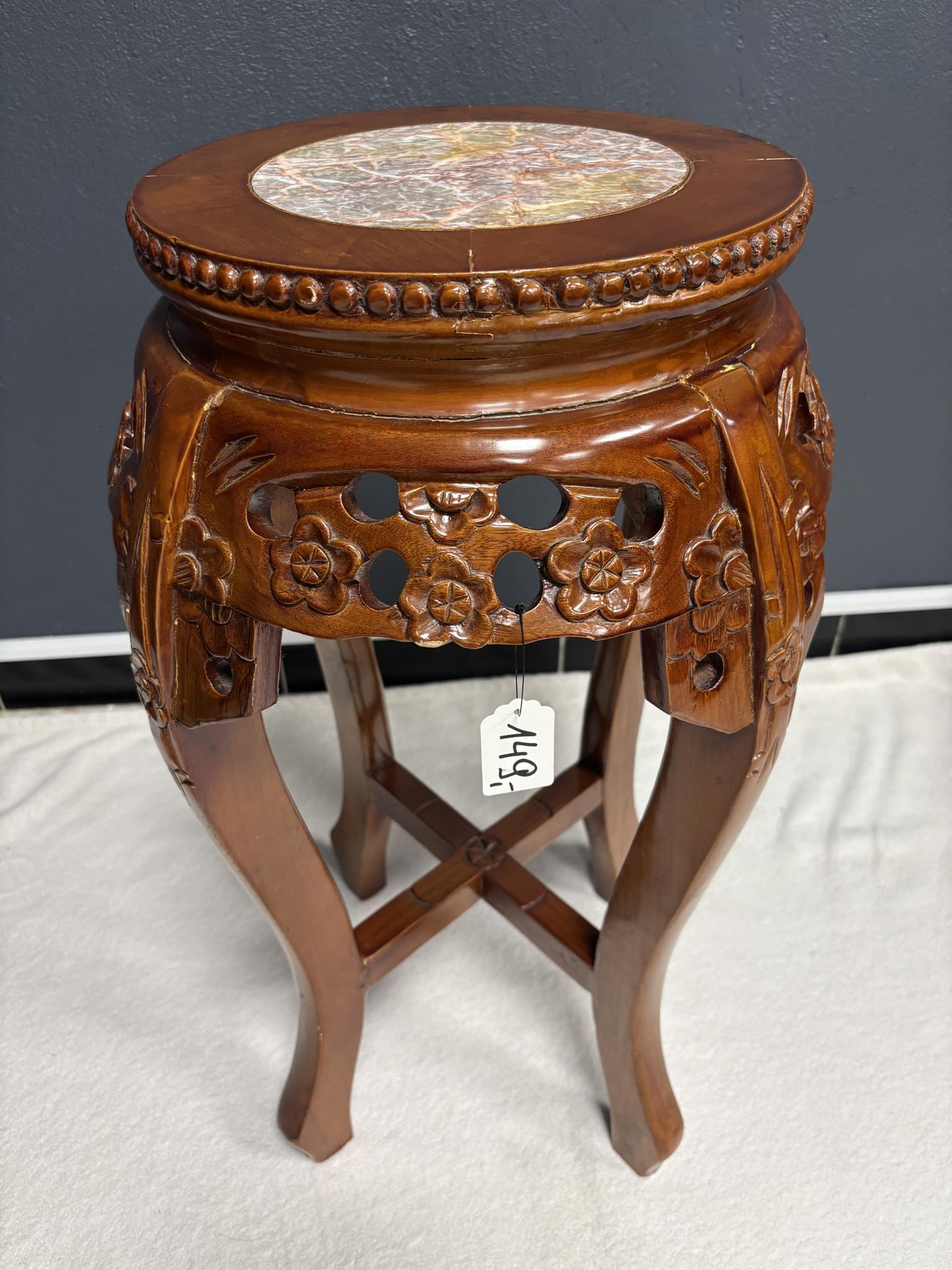 Beistelltisch aus Holz mit Steinplatte – geschnitzt