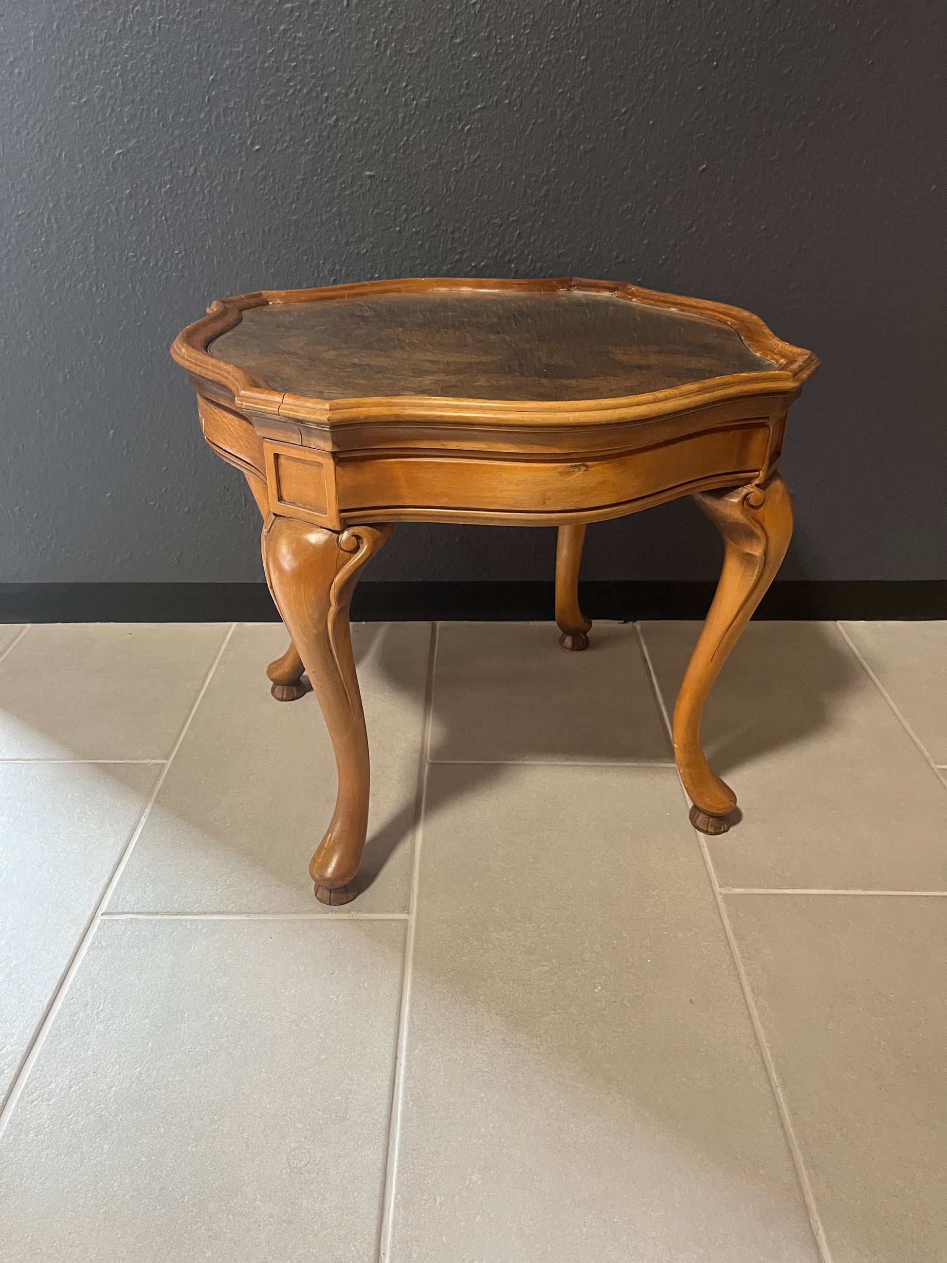 Eleganter Beistelltisch mit typischen geschwungenen Queen-Anne-Beinen und furnierter Tischplatte. Der warme Holzton und die klassische Form machen ihn zu einem zeitlosen Möbelstück, perfekt als Sofatisch, Beistelltisch oder dekoratives Einzelstück.