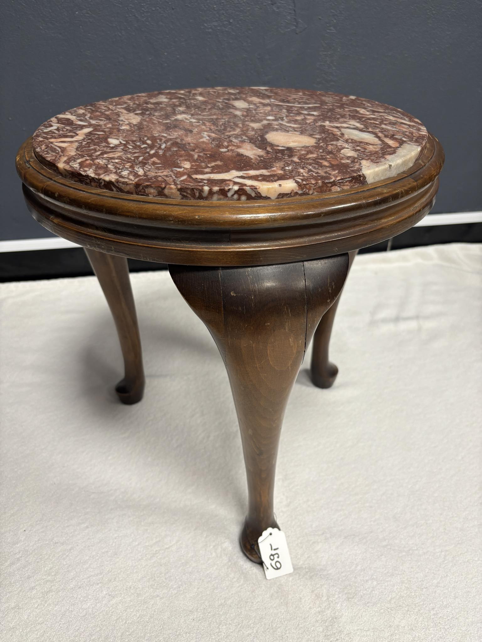 Eleganter Beistelltisch aus Holz mit runder Marmorplatte. Klassische Form mit geschwungenen Beinen, ideal als Deko- oder Ablagetisch.