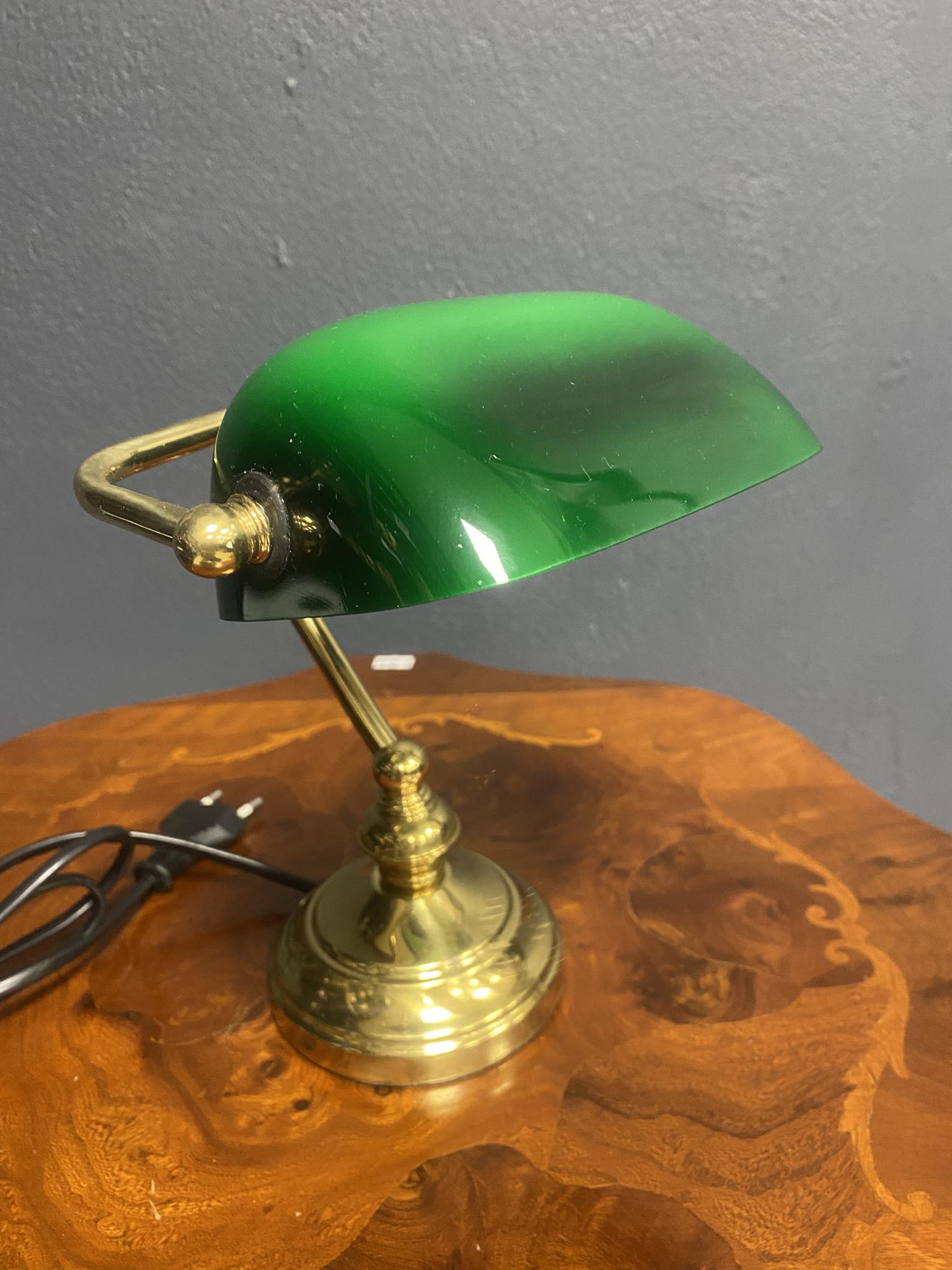 Zeitlose Bankerlampe mit grünem Glasschirm und massivem Messingfuß. Ideal für Schreibtisch, Büro oder als stilvolles Akzentlicht im klassischen Interieur.