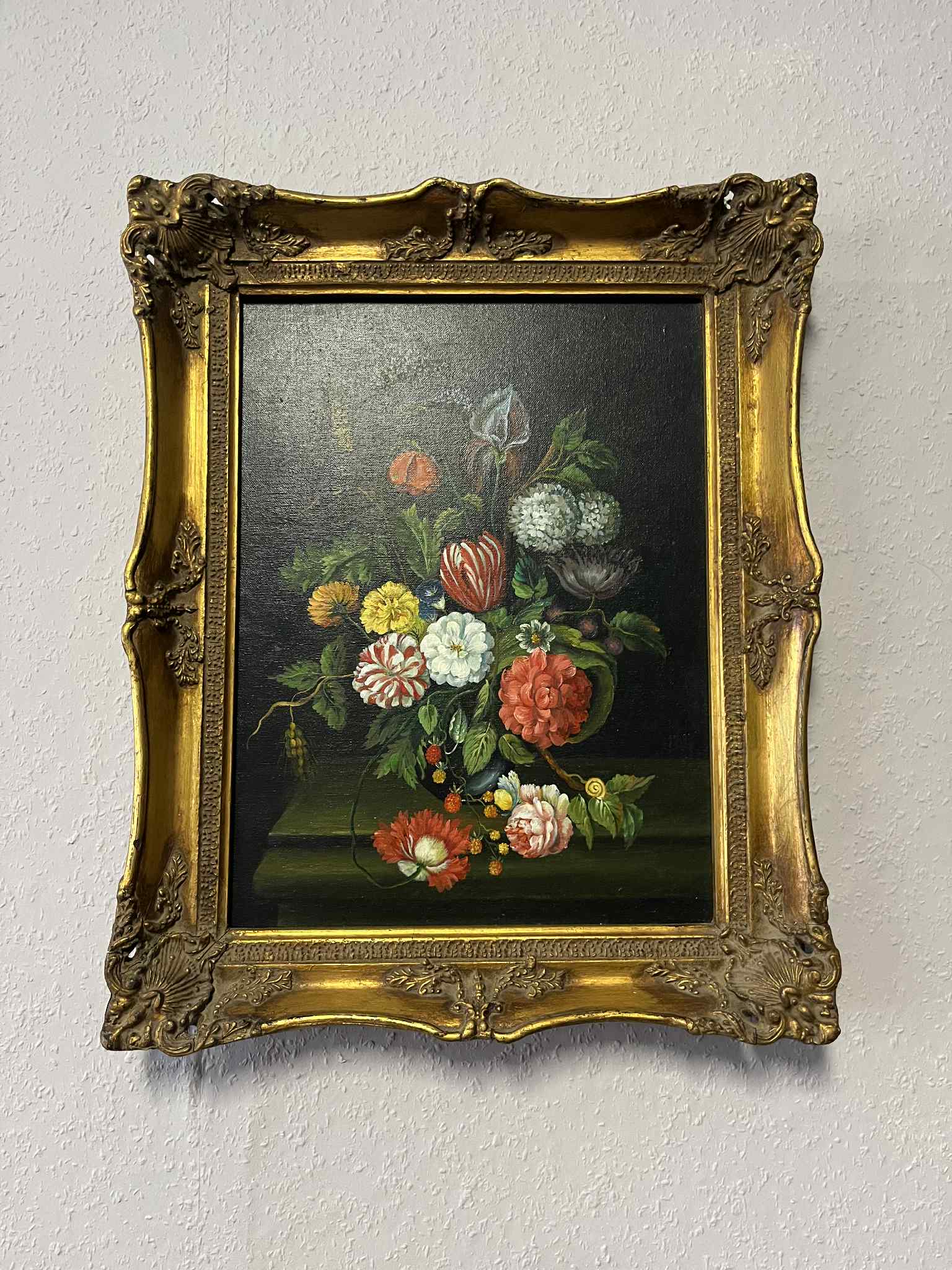Stillleben mit Blumenstrauß – Öl auf Leinwand, Barockrahmen
