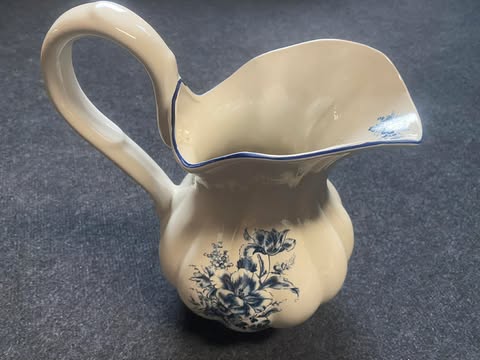 Klassisches Waschset bestehend aus Krug, Schüssel und Zubehörteilen, blau dekoriert.