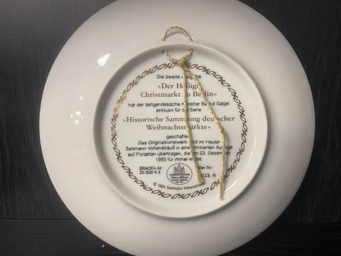 Limitierter Wandteller aus der Serie „Historische Sammlung deutscher Weihnachtsmärkte“, zeigt eine detaillierte Winterszene des Heilig-Christmarkts in Berlin. Mit Aufhängeband.