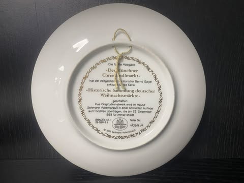 Limitierter Wandteller aus der Serie „Historische Sammlung deutscher Weihnachtsmärkte“, zeigt eine detailreiche Winterszene vom Münchner Christkindlmarkt. Mit Aufhängevorrichtung.