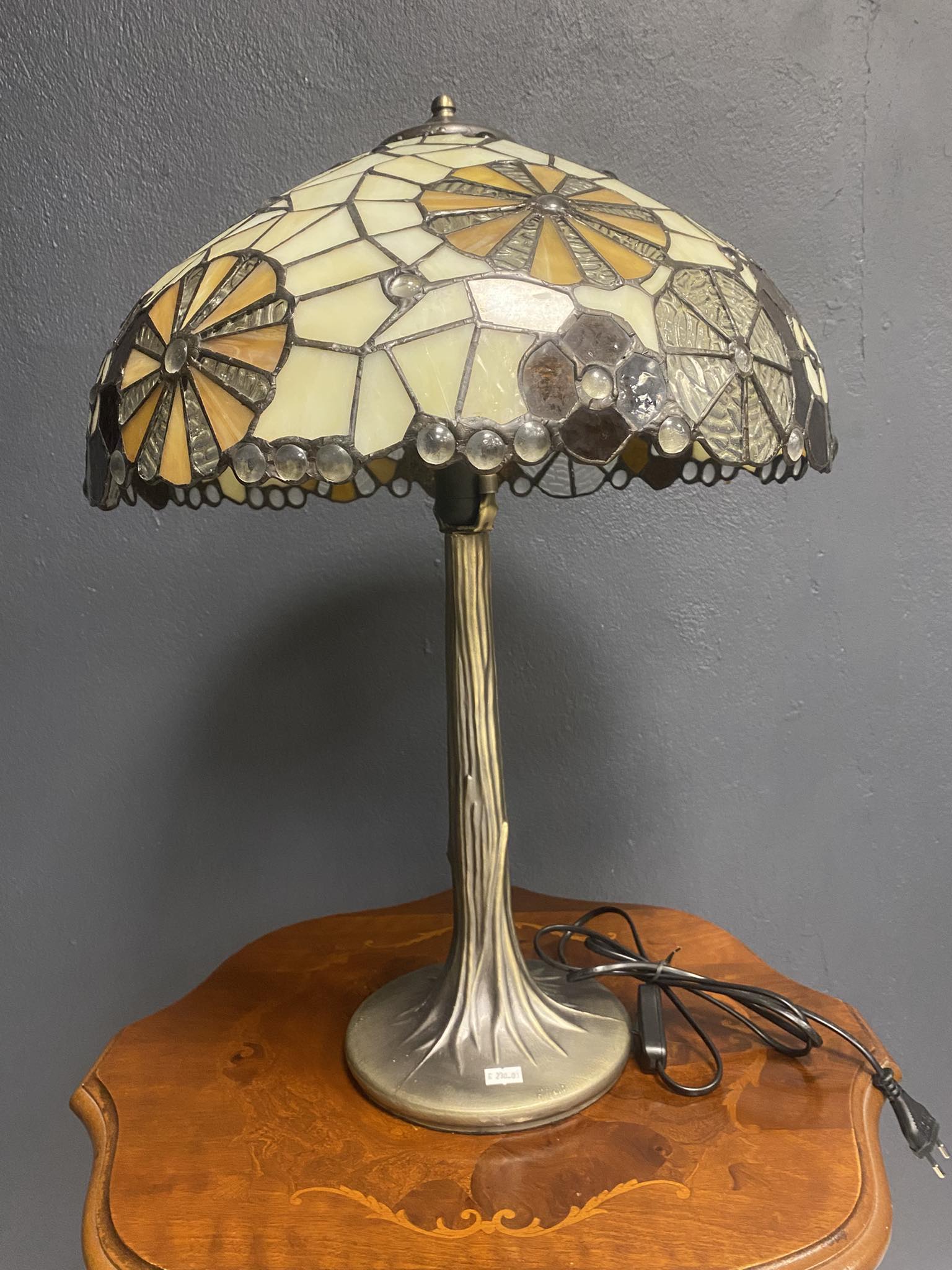 Dekorative Tiffany-Tischlampe mit handgearbeitetem Glasschirm in warmen Creme- und Bernsteintönen. Der massive Metallsockel sorgt für Stabilität und unterstreicht den klassischen Charakter.