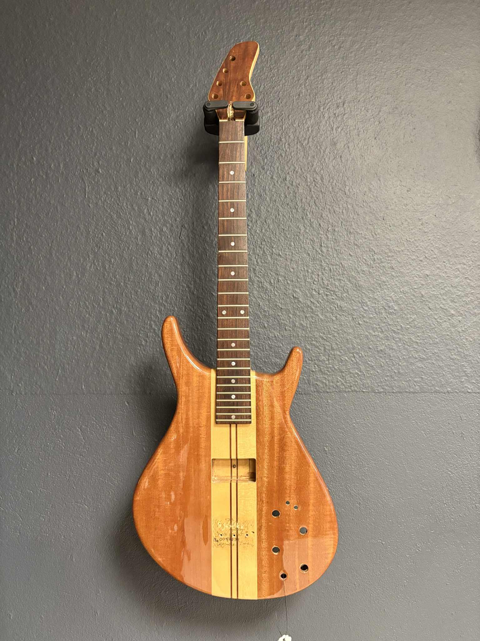 Diese unvollständige E-Gitarre eignet sich ideal als Projekt oder Ersatzteilspender. Der Korpus und Hals bestehen aus massivem Holz mit schöner Maserung – eine gute Grundlage für individuelle Umbauten oder Restaurationsarbeiten.