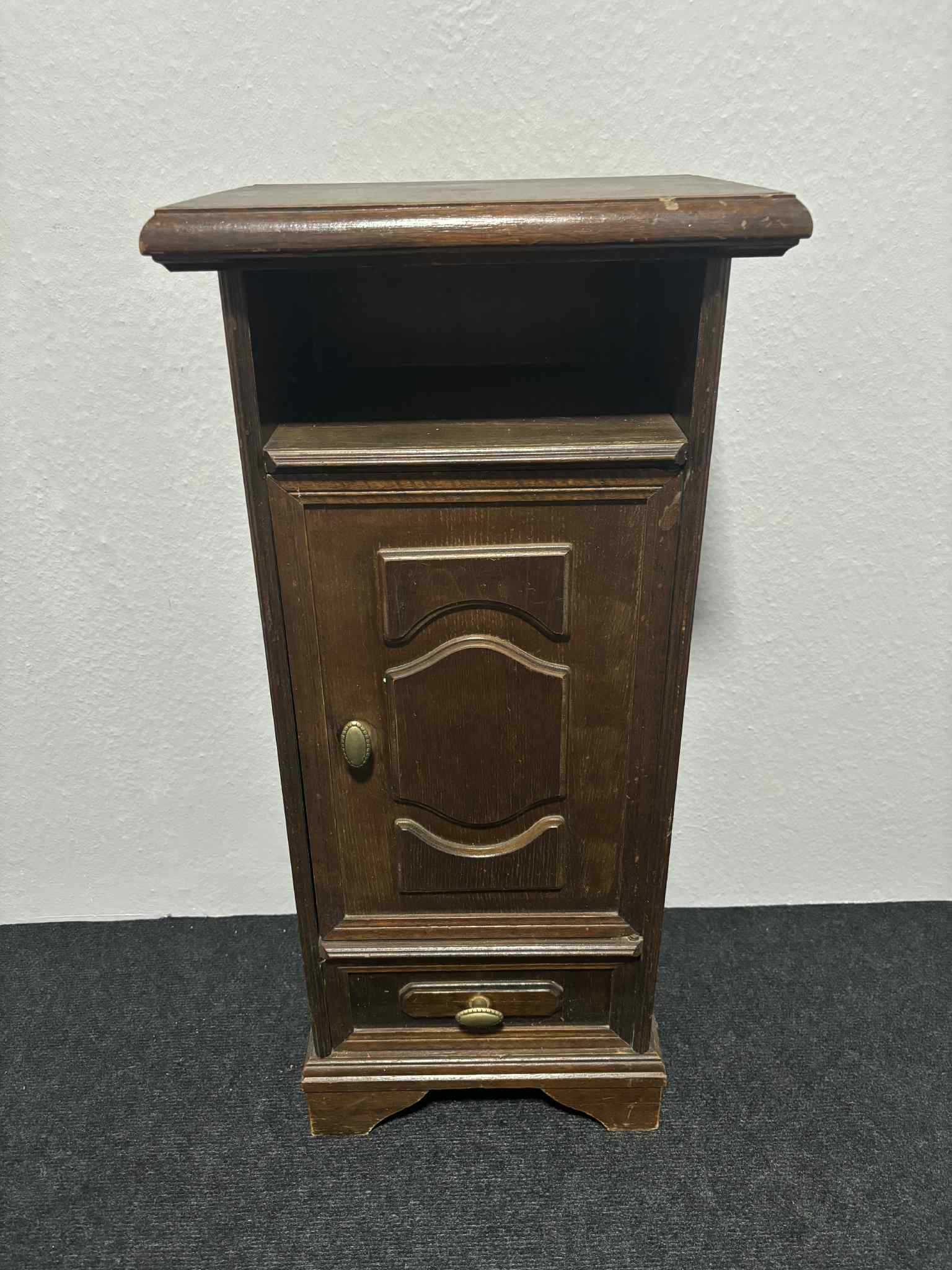 Kleiner Vintage-Nachtschrank aus Holz mit dekorativen Fronten und Messinggriffen. Der Schrank verfügt über eine Tür, eine Schublade sowie eine offene Ablagefläche – ideal für Bücher, Lampe oder persönliche Gegenstände. Ein praktisches und charmantes Möbelstück im klassischen Retro-Stil.